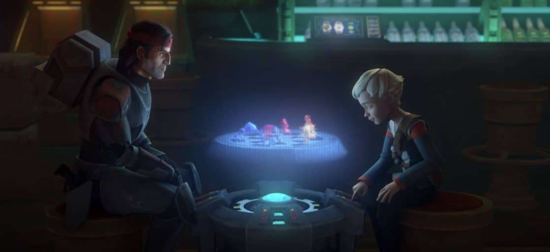 Mentre la squadra è in missione, Omega inizia a giocare a Dejarik (gli scacchi olografici comparsi per la prima volta in Episodio IV sul Millennium Falcon) con alcuni avventori che – loro malgrado – scoprono nella ragazzina una formidabile giocatrice. Cid fiuta subito l’affare, a convince il clone a giocare per denaro.