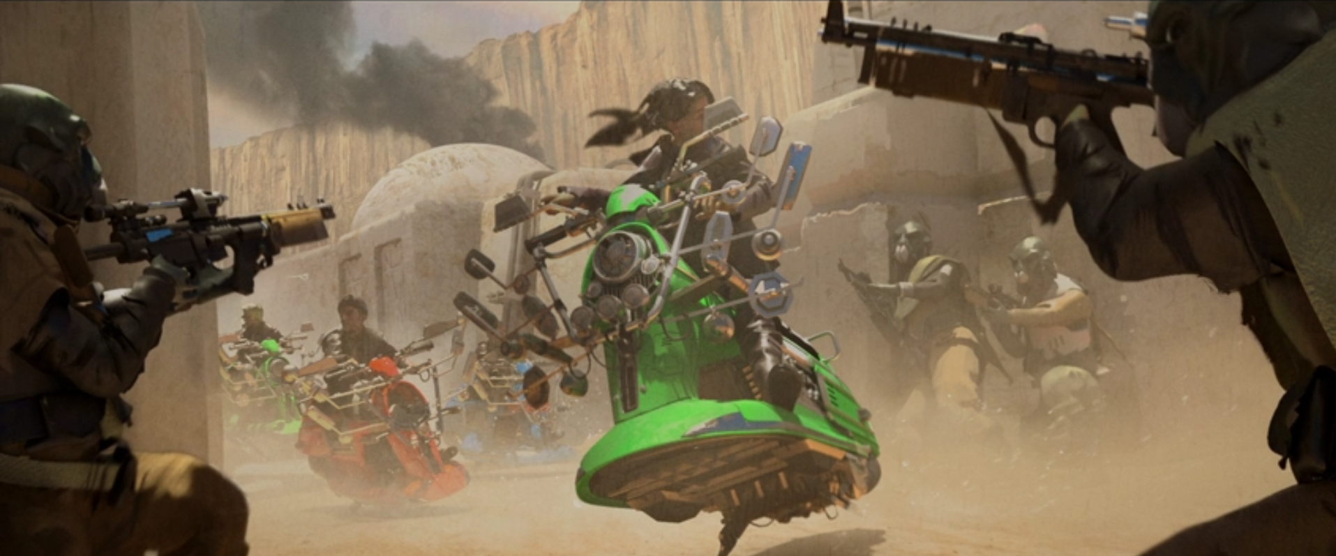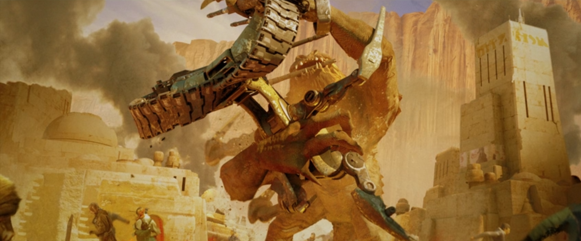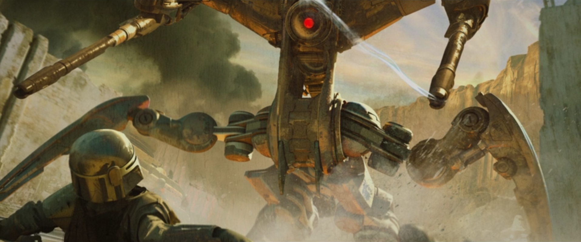 L’assedio non è finito, però: i Pyke sguinzagliano due enormi droidi Scorpenek (altro elemento legends che torna canonico in questo episodio), molto simili ai droideka separatisti comparsi nella trilogia Prequel. Le armi dei nostri eroi nulla possono contro gli scudi dei droidi, che sembrano avere la meglio.