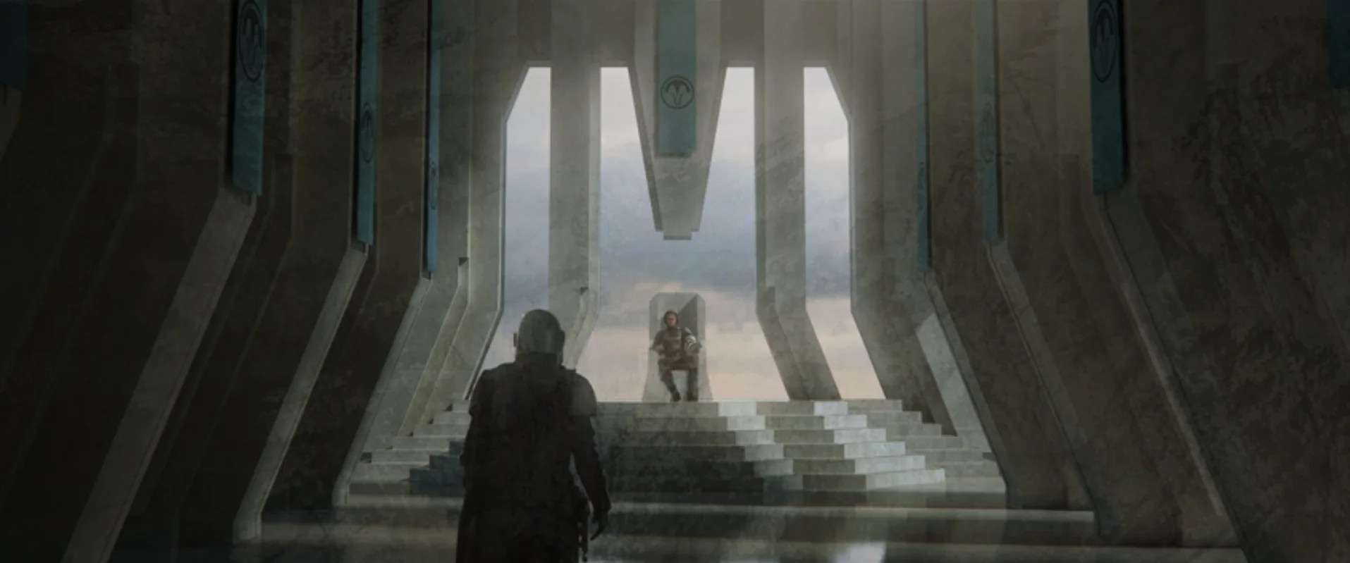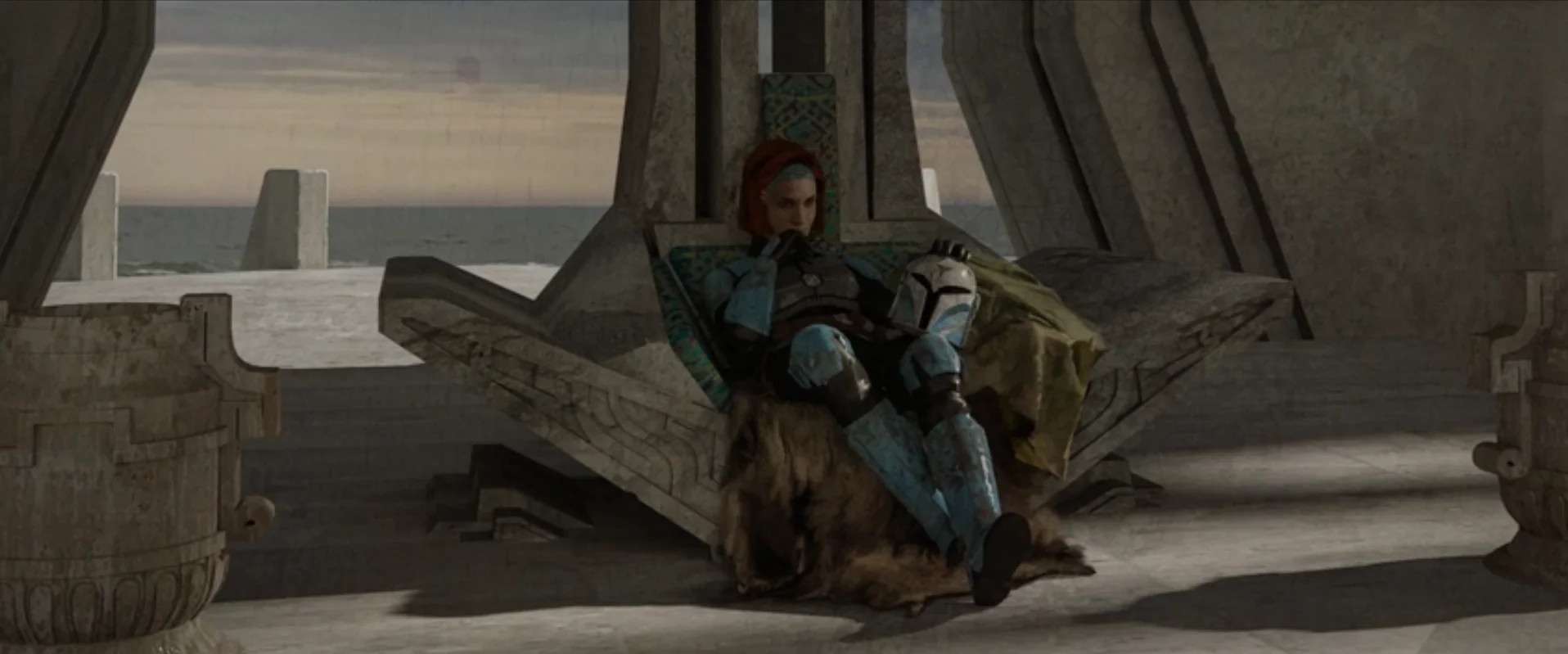 Qui, sul suo trono, troviamo Bo-Katan Kryze, ormai abbandonata da suoi uomini che hanno preferito seguire un’altra strada dopo aver visto la loro leader fallire nel tentativo di rientrare il possesso della Spada Oscura, la leggendaria spada laser forgiata dal primo mandaloriano Jedi, Tarre Vizsla, e che dona al suo possessore il diritto di regnare su Mandalore.