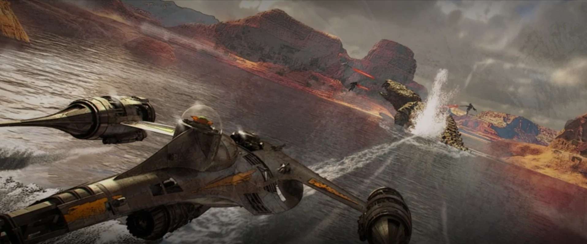 [perfectpullquote align=”full” bordertop=”false” cite=”” link=”” color=”” class=”” size=””]Io giuro sul mio nome, e sul nome degli antenati che percorrerò la via del Mandalore, e le parole del credo saranno sempre forgiate nel mio cuore. Questa è la via. Da questo momento in poi, io non mi toglierò più l’elmo.[/perfectpullquote]Le ultime parole del giuramento vengono però interrotte da una sinistra vibrazione che annuncia il violento arrivo di una gigantesca creatura marina, che emerge dalle acque e attacca i mandaloriani.