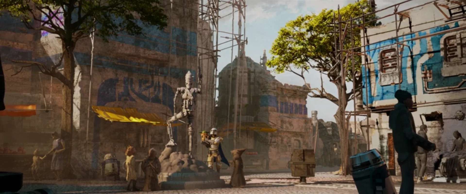 Al centro della piazza svetta ancora la statua dedicata a IG-11, composta dai pezzi recuperati del droide che tempo addietro sacrificò la sua vita per salvare i nostri eroi. Proprio in questa rinnovata e spensierata cornice Greef Karga fa la sua apparizione.